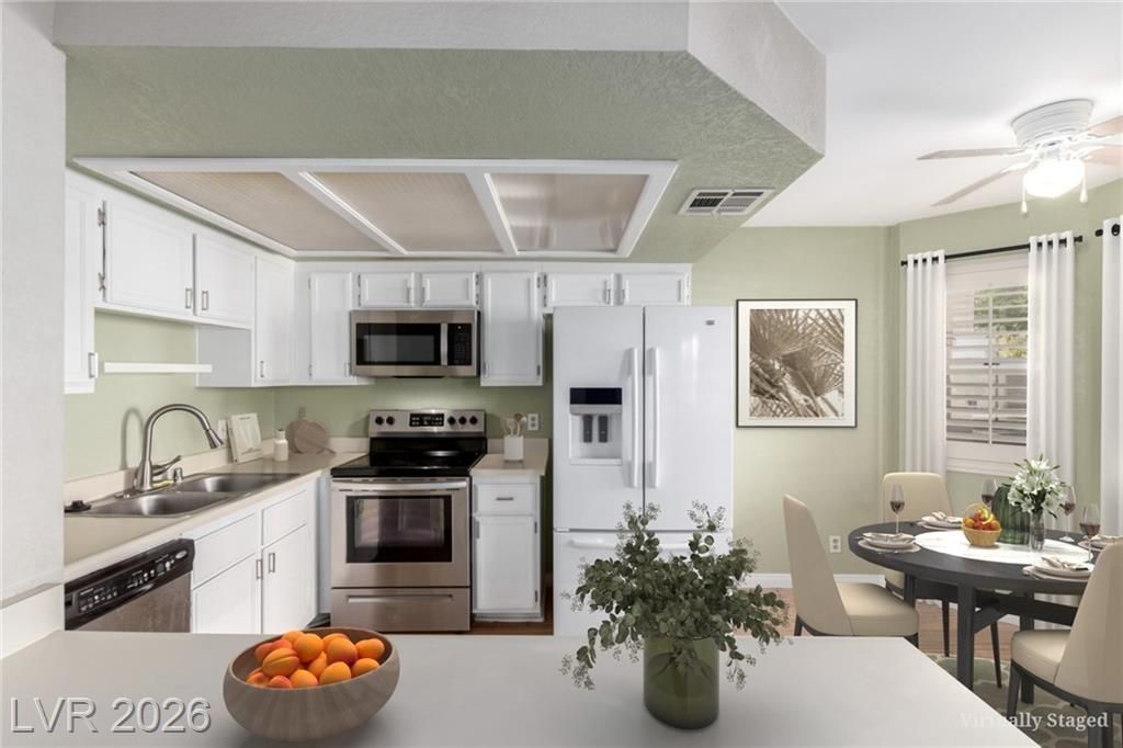 Take a look at this move-in ready 2-bedroom, 2-bathroom ground-floor condo in Rock Springs Vista, Northwest Las Vegas, minutes from Summerlin. Features woodgrain flooring, stainless steel appliances, a wood-burning fireplace, and custom shutters with security locks. The unit is fully updated with smooth ceilings (popcorn removed), refreshed kitchen and bathroom cabinets, and a freshly painted primary bedroom. A brand-new high-efficiency AC unit combined with a sun-sheltered unit orientation keeps the home naturally cooler and electric bills significantly lower than comparable units. HOA includes pools, spas, and beautifully maintained grounds. Enjoy walkable access to Summerlin's top shopping, dining, and parks, plus quick connections to US-95 and the 215 Beltway. Red Rock Canyon is minutes away. Comfort, style, and location, this one checks every box and is priced below comps.