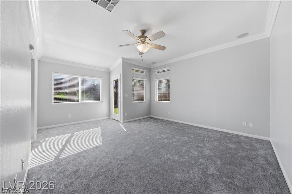 Light and bright single-story home in the heart of highly desirable Green Valley! This well-beautiful residence offers 3 (+den) or 4 bedrooms, 2 bathrooms, and a spacious 3-car garage. Fantastic curb appeal welcomes you into an inviting interior featuring tile flooring throughout the main living areas, granite countertops, and included appliances. The beautifully upgraded primary bathroom showcases a large walk-in shower and modern finishes, creating a spa-like retreat. Fresh interior paint and brand-new carpet in the bedrooms add a clean, move-in-ready feel. Step outside to a covered rear patio and a low-maintenance backyard with synthetic grass. Elevated above the homes behind, the yard captures stunning mountain views. Conveniently located just minutes from the District at Green Valley Ranch with easy access to the 215 freeway, shopping, dining, and entertainment.