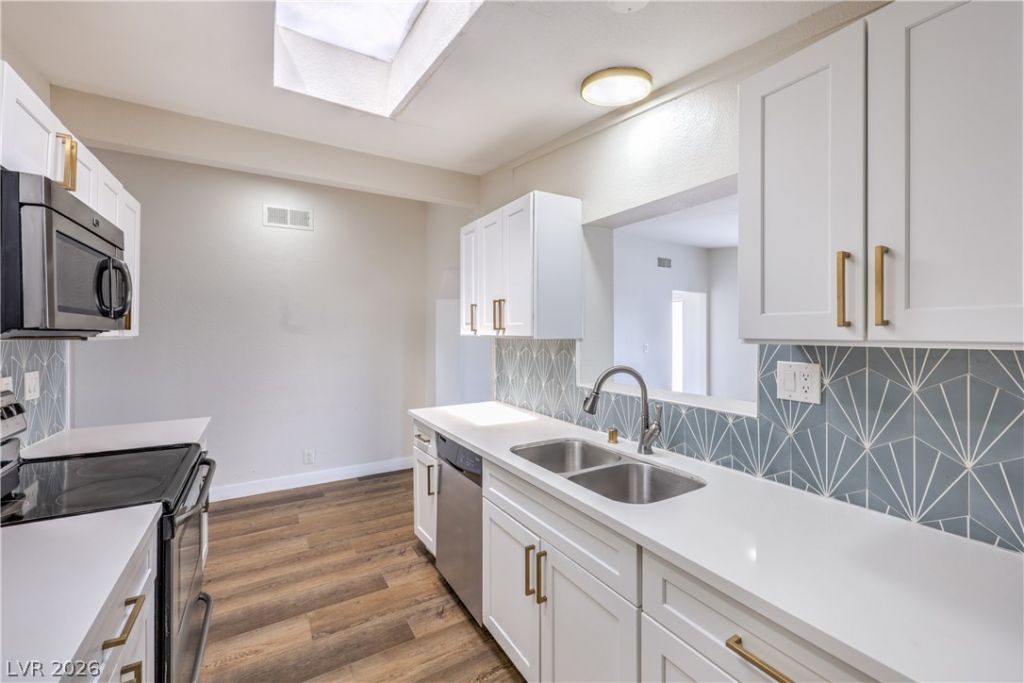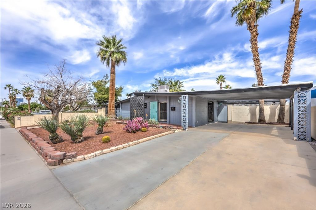 Located just minutes from the world-famous Las Vegas Strip and vibrant Downtown Las Vegas, offering easy access to top-tier dining, shopping, entertainment, and major freeways! This stylish mid-century modern home features rare RV parking, a 2-car attached covered carport, and an extended driveway accommodating up to four additional vehicles. Inside, enjoy laminate wood flooring with no carpet, creating a clean and modern aesthetic and spacious backyard with workshop. Upgraded kitchen boasts a skylight, custom tiled backsplash, brand-new shaker cabinetry, and sleek white quartz countertops. Beautifully renovated bathrooms showcase floating vanities, gold-accented hardware, designer tile flooring, and tiled showers with waterfall shower heads! Move in ready!