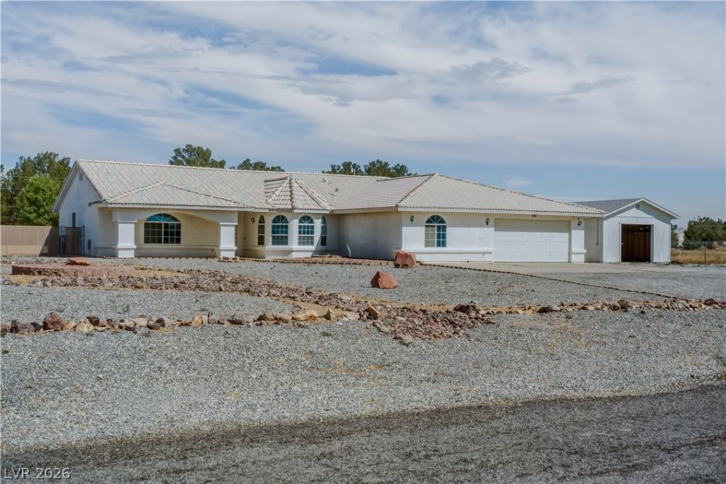 OVERSIZED EVERYTHING! Check out the 3D virtual tour link. Spacious and versatile 4-bedroom, 3-bath home on a full acre in a desirable area surrounded by custom homes. This property features DUAL PRIMARY SUITES?perfect for added flexibility. Enjoy vaulted ceilings and generously sized rooms throughout, plus a large kitchen with ample space for cooking and gathering. The oversized attached 2-car garage offers extra room for storage or workspace, complemented by a detached 1-car garage featuring a unique stained glass window for added charm. Additional storage sheds provide even more functionality. Equipped with a private well, septic, water softener, and reverse osmosis system. The backyard is chain-link fenced, and the circular drive offers easy access and plenty of parking. A rare combination of space, comfort, and practicality?don't miss it!