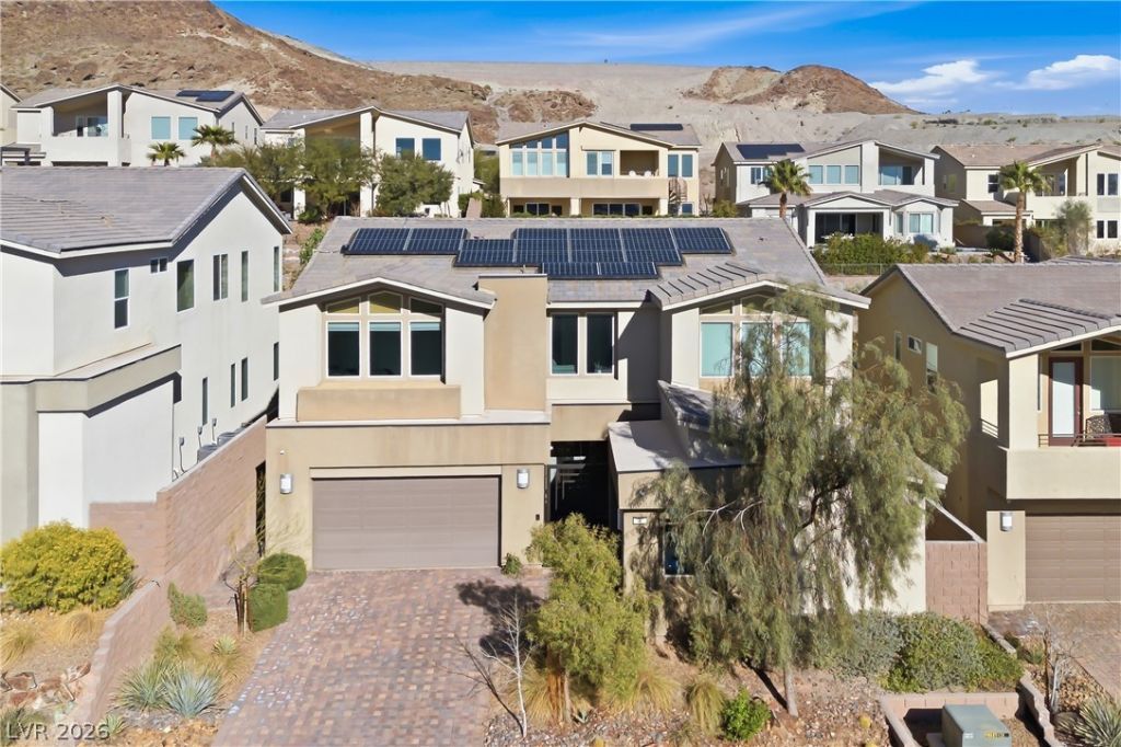 Spectacular modern William Lyon 4 bed 4.5 bath home with heated pool and spa in the award winning community of Lake Las Vegas. The kitchen showcases an oversized quartzite island with added storage. Top of the line built-in monogram fridge freezer, & custom painted cabinets. Family room features 21 foot ceilings and stone feature wall, with bright and airy feeling thanks to the large windows. Enjoy your favorite beverage at the built in bar with wine fridge. Indulge in the primary suite where double doors welcome you to your bedroom and spa like bathroom featuring a large soaking tub, walk in shower, & separate vanities. Ample storage awaits you in your floor to ceiling custom built closet, and a large balcony is great for those relaxing evening retreats. Enjoy a movie in your Media room with bar area just outside. This home comes with all round security camera system and security gates with keyless entry. Fully paid off TESLA solar (10.8kw) with 3 TESLA powerwalls and car charger